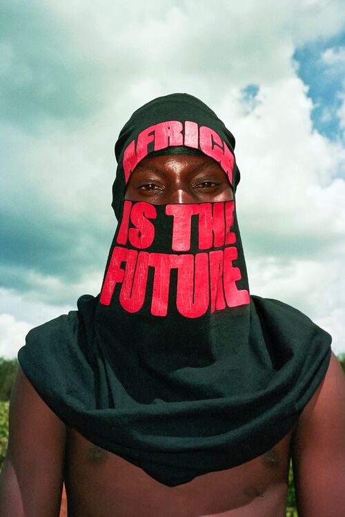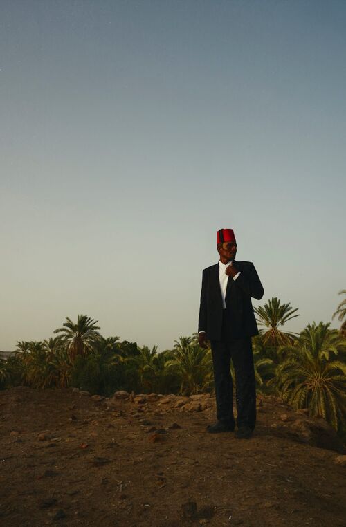 Beyond this emblem, Lamrabat’s images are unified by a compositional framing and elemental harmony borrowed from the Berber flag. “Generally, I really like symmetry,” Lamrabat explained. “But with these works specifically, I was inspired by the three horizontal lines of the flag and their colors, which represent the sand, the mountains, and the sky. The central symbol, representing a body or person, occupies all three of these territories.” In the flag, the figure’s head remains in the top third of the composition, a positioning Lamrabat mirrors in his own photographs, where his subjects’ heads are shown against the sky.