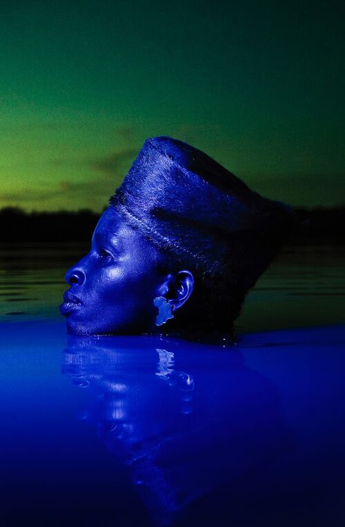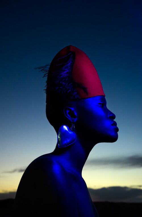Western cultural cues often make appearances across Lamrabat’s work. In National Treasure (2024), also included in the show, a model bathed in cobalt hues stares down the lens while wearing a necklace of Laughing Cow cheese triangles. “Growing up in Europe, it felt like a logo represented a certain status, but we were too broke to have anything that was branded,” the photographer said. “Later, I realized that was the best thing that could have happened to me because it meant we had to get creative at a very young age.” Even something as seemingly artless as small, branded triangles of cheese hold profound symbolism, serving as what Lamrabat describes as cross-cultural “touchstones.”