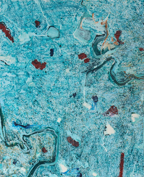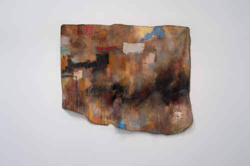 Self-taught artist Ashley Cole’s earthy, mottled paintings bear the influence of Black abstractionists before her: She channels the energetic markmaking of Mary Lovelace O’Neal and uses draped, unstretched canvases like Sam Gilliam’s. Building from a foundation of brown and black hues, which reference melanated skin, Cole layers streaks of colored oil pastel and wide slashes of paint that drip down the canvas like tears. Indeed, the artist’s practice is charged with feeling, which flows intuitively and cathartically into her abstract gestures. “During the creation of this piece, I shed layers of old emotions, delving into memories and releasing preconceived notions of what I thought this piece should be,” she wrote on Instagram of The shed (2024), a work that is featured in Rele’s presentation at Black-Owned Galleries Now.