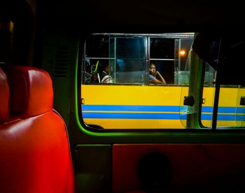 From her Caribbean home of Barbados, Kadiejra O’Neal captures scenes from her everyday life in photographs, several of which are on view in Experience Jamaique’s presentation in Black-Owned Galleries Now. For instance, in Window Seat (2019), a woman looks out of the corner of her eye at the viewer as she leans out of a bus window. Taken from the vantage point of another vehicle at night, the photograph, with its flashes of yellow and red, evokes an instant of human connection amid the hustle and bustle of city life.