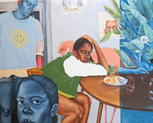Canadian artist Bria Fernandes specializes in figurative portraits that capture Black women in moments of contemplation, their gazes drifting into a world of introspection. Her painting Come Rain or Shine (2023) depicts a young girl leaning dejectedly against a wooden dining table, two superimposed ghostly blue figures echoing her pose. This painting is featured in Kanbi Projects’s booth at Black-Owned Galleries Now.