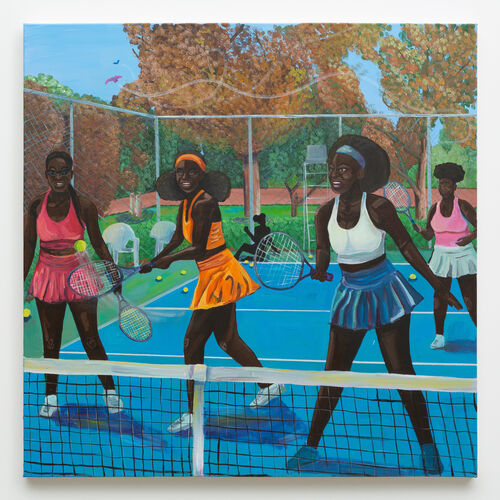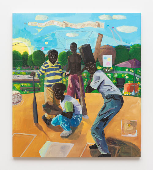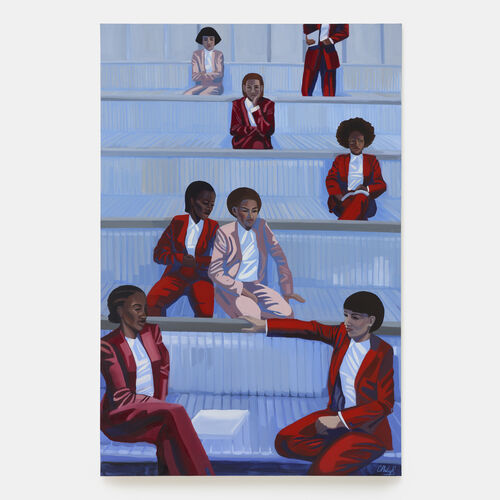 In The Debate (2022), which is included in Ojiri Gallery’s presentation in Black-Owned Galleries Now, the setting is cryptic: A cadre of figures congregate on tiered rows of powder-blue banquet seating that give the painting a strong vertical pull. These women’s coordinated pink and red pantsuits convey power, but also conformity; it is unclear whether the titular debate is among them, or against some unseen adversary. This lack of resolution is common in Philips’s paintings, imbuing them with psychological complexity and intrigue.