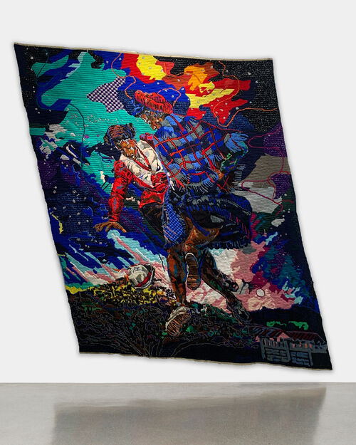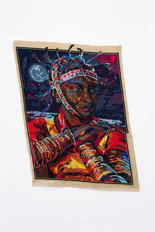 The artist has also translated these portraits into textiles, two of which are currently featured in Black-Owned Galleries Now, presented by BKhz. In one of these works, he depicts his protagonist Nomalizo Khwesi in the middle of a coming-of-age ritual, centering the transition to womanhood within a liberated, decolonized future. By conjuring these semi-divine avatars, Ruga places Black, queer, and femme experiences within a reimagined world order.