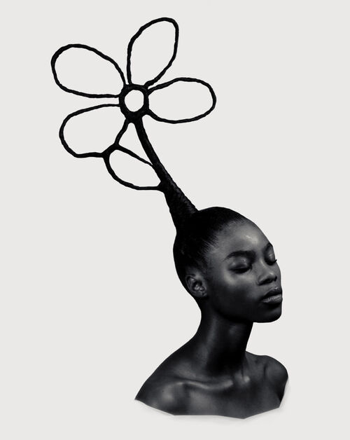 Several of O’Neal’s photos, shot in black and white, study the multiplicity of Black hairstyles. For example, Black Enough (2015) shows a head from behind, its hair split in half. One side is chemically straightened, the other worn in a natural afro. The work, with its provocative title, seems to reference the arduous social codes Black women navigate when styling their hair.