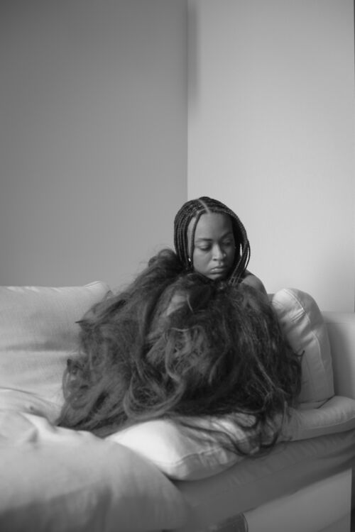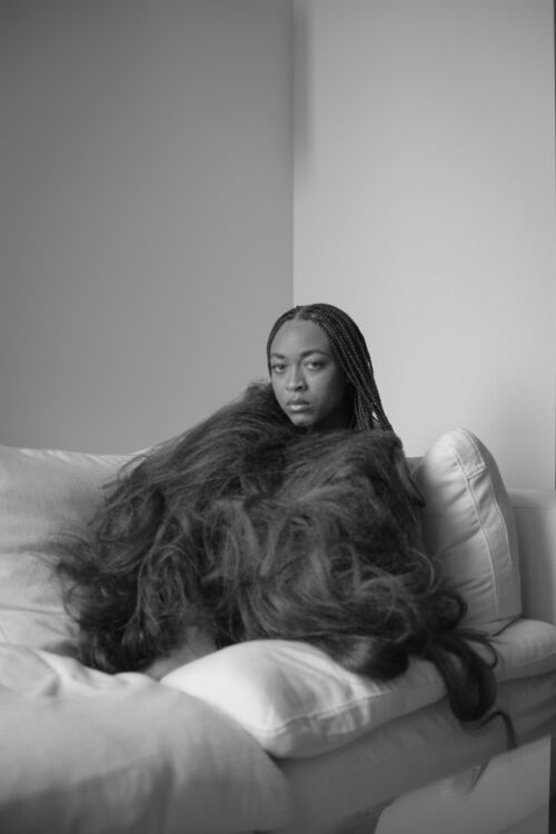 For instance, her “X-pression” series (2022), on view in Cierra Britton Gallery’s presentation in Black-Owned Galleries Now, is an exploration of her own identity. In six black-and-white portraits, Lee lounges on the couch, her body covered in a fluffy, hair-like material. These stark, contemplative photographs evoke the long history of Black women’s relationship with hair.