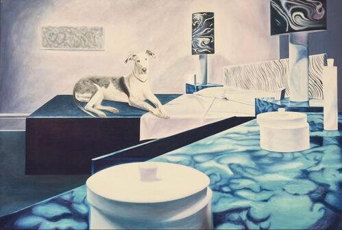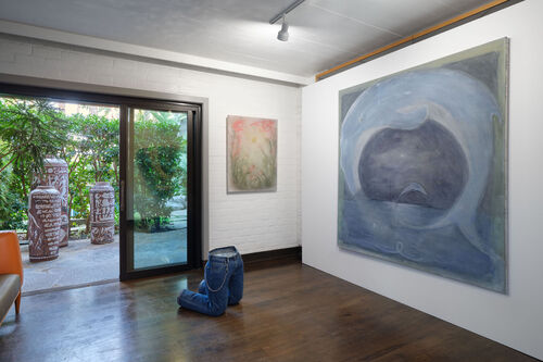The gallery staged a group presentation in a poolside cabana featuring the works of L.A.-based artist Tara Walters, who lost her home in the fires. A standout is Blue (For Jack Bendes) (2025), which depicts a giant blue dolphin jumping above the ocean. Walters is known for her process-driven approach: She often pours ocean water over acrylic-painted canvases, allowing the drying patterns to shape her imagery.