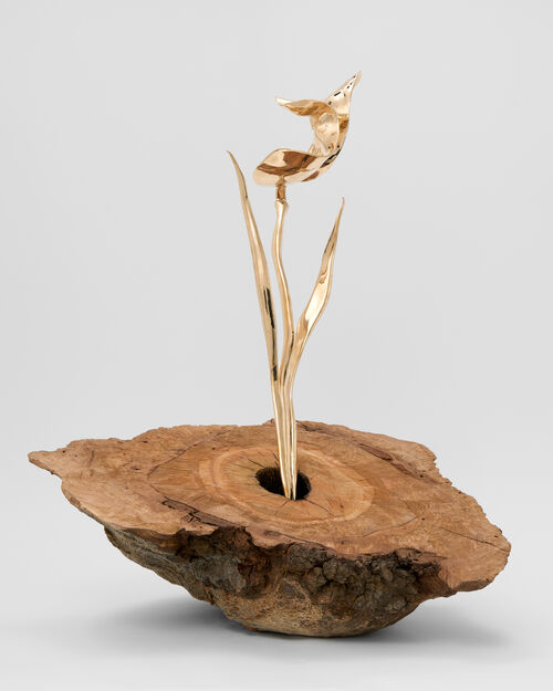 Among the galleries circling the pool is local stalwart Nicodim. The poolside cabana features a “smorgasbord of our best and brightest,” according to the gallery’s partner Ben Lee Ritchie Handler. At the center of the booth is Isabelle Albuquerque’s sun flower (2024), a delicate bronze flower sprouted from a piece of Pacific live oak. Scattered throughout the booth are humanoid stoneware sculptures by L.A.-based artist Stanley Edmondson. Works in the booth are priced between $5,000 and $45,000.