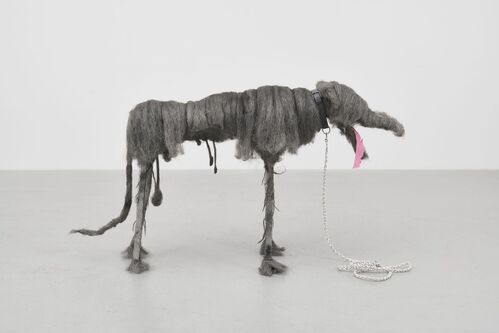 Another body of work featured in “A Number of Things” is Henrot’s series of whimsical dog sculptures. With nearly a dozen examples in the show, this body of work speaks volumes about Henrot’s practice and her interest in manufactured order. The sculptures represent a variety of materials and breeds: Schoggi (2024) is a sleek steel version with a long snoot, perhaps a borzoi; Francesco (2024) is a stout, carved wood example resembling a pitbull; and Richelieu (2023) is an Irish wolfhound made with steel wool, wood, and textile.