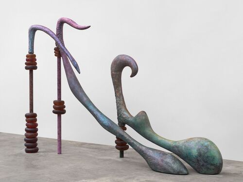 This poetic account of the social order was offered in relation to Henrot’s new series of bronze sculptures, titled “Abacus.” Inspired by the ancient counting tool, these large, patinaed works are featured in “A Number of Things,” Henrot’s current solo at Hauser & Wirth’s 22nd Street location in New York (on view through April 12th). Together with new and old sculptures and collages also included in the exhibition, these works examine the structures that undergird our world—both visible and invisible—and question how and why they’ve become fundamental to our ways of living.