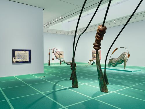 Today, with “A Number of Things,” Henrot draws attention to systems that govern perception and experience—from the days of the week to the way numbers signify values—and highlights their arbitrary nature. For the “Abacus” sculptures, for example, Henrot literally and conceptually bends the familiar form of the calculating device, which consists of beads that are slid across rods set inside a frame. The work 1263 / 3612 (Abacus) (2024) contains three bronze posts resembling those of the tool, each stacked with bead-like rubber rings. However, Henrot has removed the posts from the abacus frame and installed them on the floor. Their ends curve, as if being pulled or blown in the wind. “By making the works look baroque and beautiful, but also childish and broken, it’s a way for me to show that systems can’t be taken too seriously,” Henrot explained.