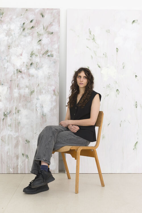 Two years later, the artist applied for Tracey Emin’s T.E.A.R. residency program in Margate. The first project in the residency required intensive self-portraiture in front of a mirror. “The mirror was a new tool because I am so tactile,” she said. From there, she then started working with photographs other people had taken of her. It was only in 2023 that she began her series of floral paintings. The next year, Emin selected her for Flowers’s annual “Artist of the Day” show; she signed with the gallery shortly after.