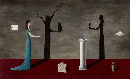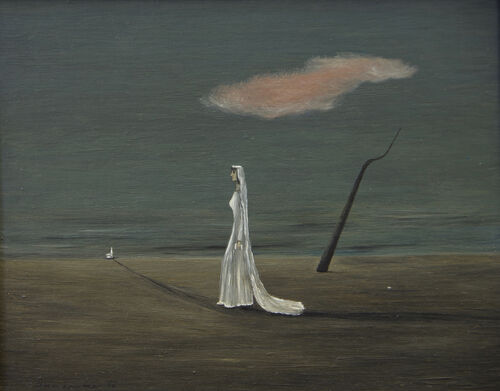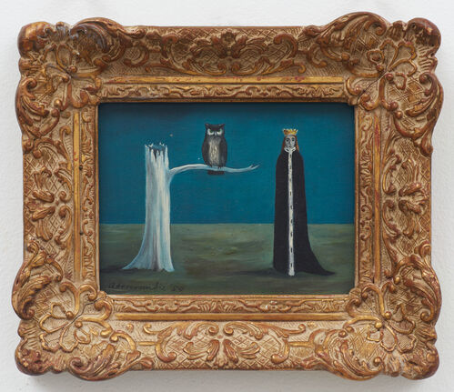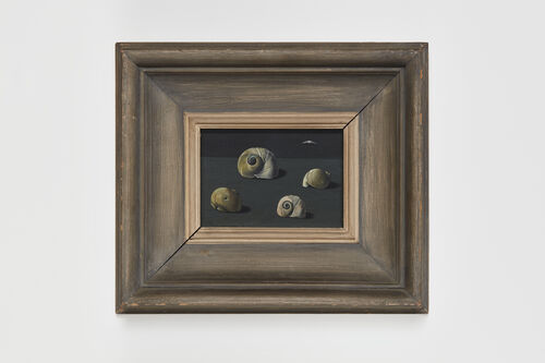 These surreal, elegant compositions often portray desolate landscapes and spare interiors populated by people, animals, or small objects. The lone, solemn woman with black hair who appears often bears a likeness to the artist herself. And in works where humans are absent, creatures and objects become compelling actors, weaving spellbinding mysteries of their own, often set within ornate frames the artist collected.