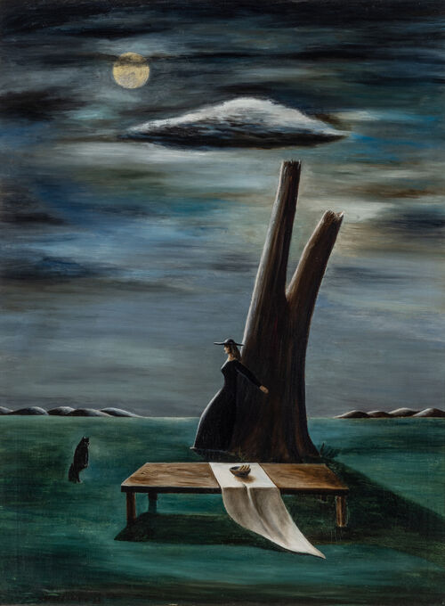 “The Whole World Is a Mystery” traces Abercrombie’s career chronologically, from “day to night,” as Crosby described it. “You feel a sense of fullness in the work at the beginning, and then it slowly diminishes. The works become smaller, the focus of her vision much more acute.” Early works show landscapes dotted with trees and cloudy skies or sweeping Surrealist works like Strange Shadows (Shadow and Substance) (1950), in which a woman, an owl, a blue cup on a pedestal, and a clock on what appears to be a stage, cast shadows that playfully riff on reality. Over time, those landscapes grow darker, skies turn from pale blue to navy and black, and waning crescent moons become the protagonists.