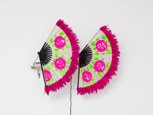 Many works in Mann’s exhibition are related to the performances and influence of Choi Seung-hee, the mother of Ahn and a world-famous Korean dancer. Through the use of electric motors and technology, Mann’s kinetic sculptures resonate with the movement of dance. For instance, Poison Fan (2025) features two brightly colored fans attached to motorized windshield wipers, evoking the traditional Korean buchaechum fan dances. Meanwhile, Solitary Dancer (2025)—a piece combining a gong, sex toys, a microphone, a speaker, and a motion detector—underscores the auditory experience of physical movement, amplifying the sounds of the gong throughout the gallery.