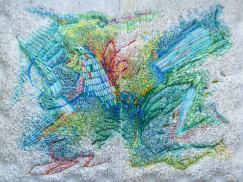 Thousands of rolled-up, hand-dyed mulberry papers make up the intricate wall works of South Korean artist Ilhwa Kim. She meticulously arranges these tubes of paper, which she endearingly refers to as “seeds,” to create textural, rippling color fields that jut out from the wall. A new series of these kaleidoscopic assemblages comprises her first solo exhibition with Maybaum Gallery in San Francisco, titled “The Geographic.”