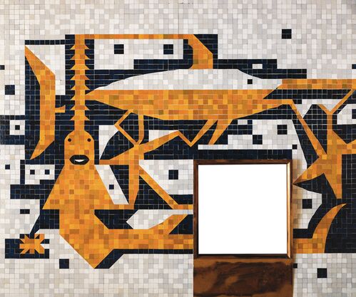 Fariji has crafted replicas of the marine-inspired ceramic murals that were originally shown at the aquarium using cardboard, resin, and copper on wood. For example, Les requins qui dansent IV (2024) features stylized shark forms against an emerald-green mosaic. Meanwhile, Les prédateurs des abysses I (2024) features a geometric sawfish among a complicated design consisting of hundreds of small green, orange, and white squares. By reviving the aquarium’s internal aesthetics, the artist intends to tap into the city’s history.