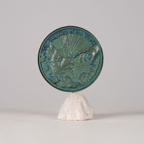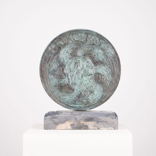 The title suggests the incomplete nature of the exhibition’s narrative of human and dog interactions. To help tell the story, Lee mythologizes the origin story of dog and man. In particular, her “Doggie Coin” series illustrates an imagined first interaction between dogs and humans on a series of circular bronze sculptures. On several of these “coins,” including Doggie Coin 2 (The Beginning of the World) (2025), she depicts a human hand reaching out to a star-eyed dog in a scene evoking Michelangelo’s The Creation of Adam (ca. 1512).