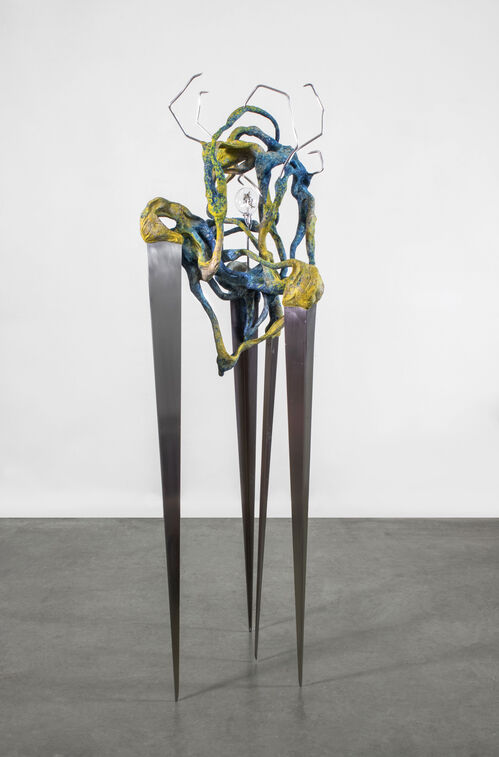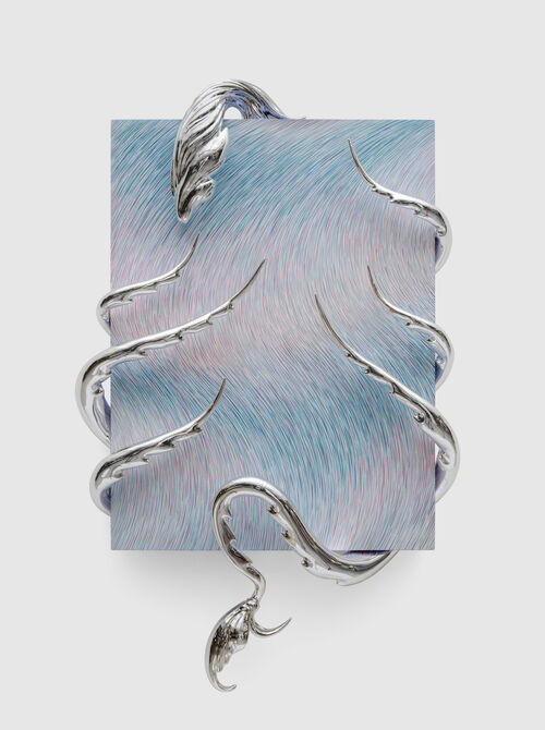 Surrounding the sculptures are abstract paintings by New York–based artist Anastasia Komar. Her work features sinuous, root-like structures made of silver electroplated polymer that entwine around the canvas. Striatum II (2024), for example, illustrates this technique with a canvas of undulating blue brushtrokes framed by tentacle-like silver limbs.