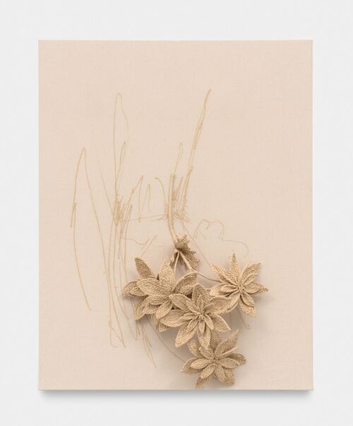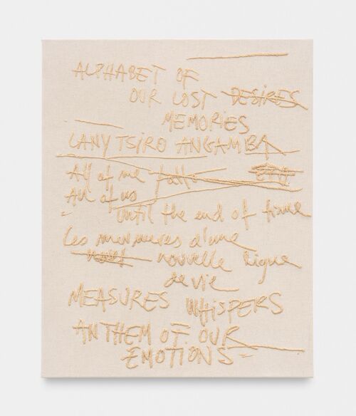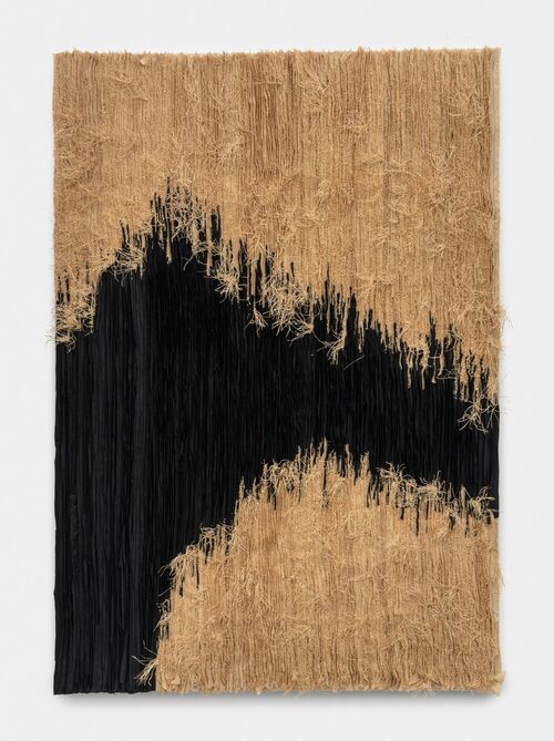 Artworks in the show include clusters of raffia-sculpted flowers languishing off one canvas and raffia words on canvas—spelling out “ALPHABET OF OUR DESIRES”—in another. Another, HANDS, FIGURES AND MIRACLE ACT I (2025), is a contemplative landscape-like cascade of raffia strips in beige and black. These works all highlight this beloved natural material and highlight the work of the technicians who manipulate it so expertly.