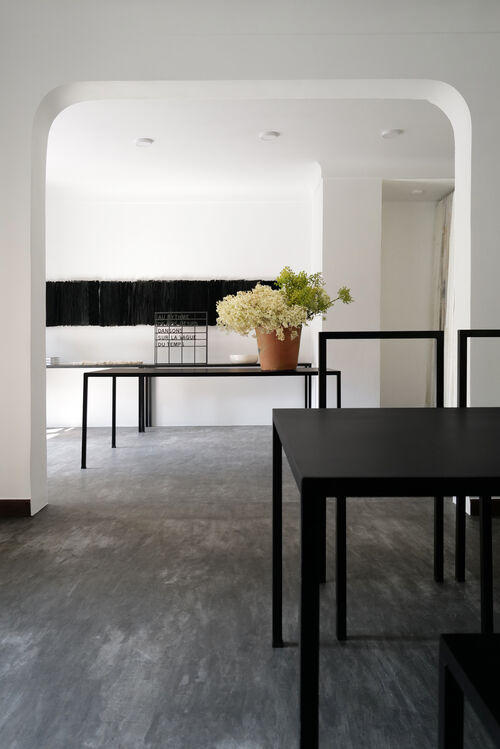 Andrianomearisoa heads to the studio in the late morning. His Paris space, in the 14th arrondissement, is near the Institut Giacometti and the Cimetière du Montparnasse (where Marguerite Duras, Charles Baudelaire, and Serge Gainsbourg are buried). He works with a team of eight people; they all gather around a large table where they discuss, organize ideas, and eat together. “The studios are like houses,” he said—a conception that is unsurprising, given that Andrianomearisoa studied at the École Spéciale d’Architecture in Paris.