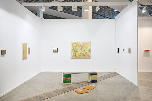 At the main fair, highlights abounded across booths. Works of merit included Kai-Chung Chang’s Ces lointaines se répètent no. 37 (2025) at Romero Paprocki; Guy Van Bossche’s Fuck Freedom (2025) and Mircea Suciu’s “Fatigue” series at Keteleer Gallery; and Bendt Eyckermans’s Emblems Lost (2025) at Mendes Wood DM (the artist is also the subject of a solo show at the gallery’s Brussels space). Further standouts included Muller Van Severen’s Frame 23 (2024) at Tim Van Laere Gallery, Markus Ákesson’s Spiritus (2025) at Berg Gallery, Angela de la Cruz’s Standing Box with Small Box (2016) at Wetterling Gallery, and Guillermo Mora's untitled sculptural paintings at Irène Laub Gallery.