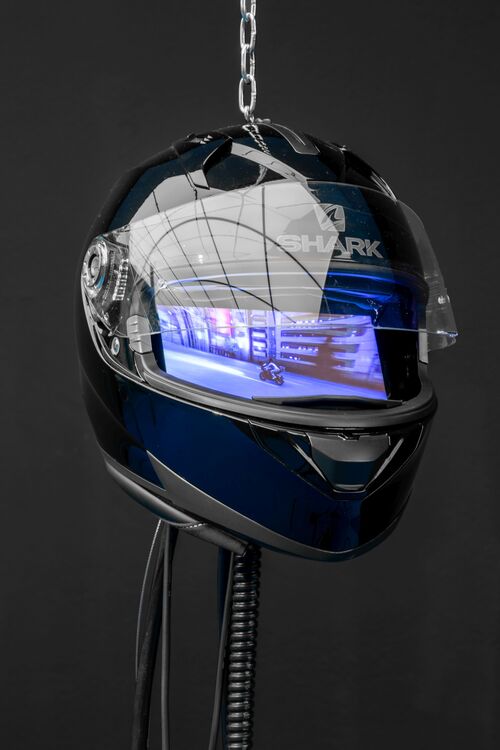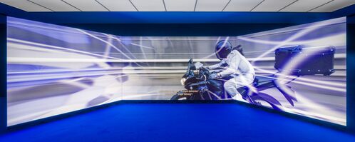 These inspirations are immediately evident in her work. The earliest piece included in the exhibition, Delivery Dancer’s Sphere (2022), portrays Ernst Mo, a female delivery driver (or “dancer,” in the parlance of her futuristic Uber-style app). Mo races against the rules of time and space, which, in this fictional version of Seoul, can sometimes be broken. Rendered in both CGI and live-action, the character zips through glitchy video game locales as well as high-rises, back alleys, and highways. Again and again, she crosses paths with En Storm, a version of herself from an alternate reality. The characters’ stories become entangled; their passionate relationship switching between romance and rivalry, a bond suggested by their anagrammed names and the single actress who plays both. “It’s tragic because they don’t have time to be together; they just chase each other,” Kim said of this Inception-style narrative of interlocking destinies and collapsing realities.