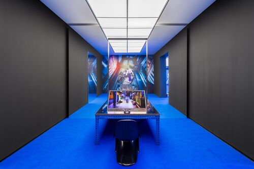 Kim’s strategy for discussing the contemporary world is rooted in speculative fiction, inspired by novelists like Octavia Butler. She is also influenced, she said, by the Argentine writer Jorge Luis Borges, who is known for his conception of life as a series of mazes. “I really wanted to make a conceptual labyrinth,” she said. Kim’s characters often weave through narrow, similar-looking passageways and M.C. Escher–esque architecture. The exhibition design of “Many Worlds Over,” too, creates a kind of labyrinth: The bright blue rooms are laid out in intentionally confusing ways, with floor-to-ceiling mirrors creating the illusion of new spaces and paths.