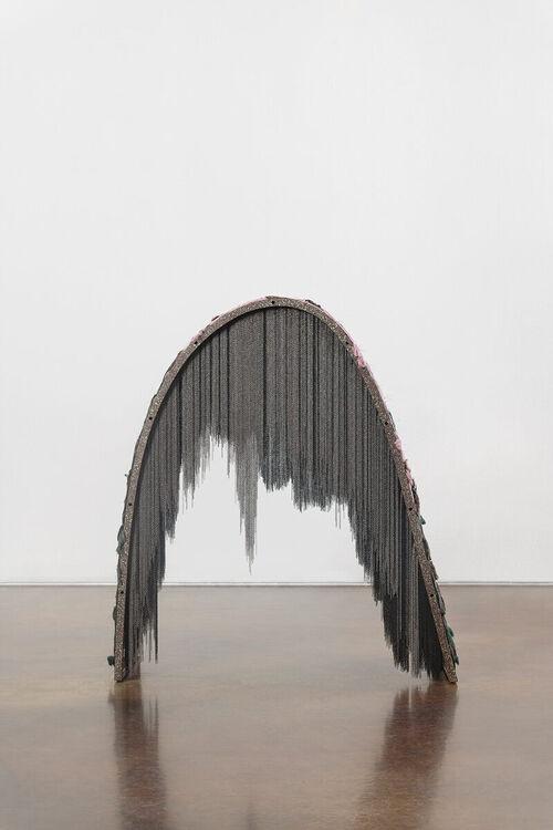 Kang often explored how humanity relates to nature, a theme evident in her “Mountain” series, which she started in 2020. The series draws on si-seo-hwa, a Joseon Dynasty painting style that integrates poetry, calligraphy, and painted landscapes. In her contemporary interpretation, Kang created arched metal forms evoking hilltops, from which strands of chain, thread, or fabric were sometimes suspended..