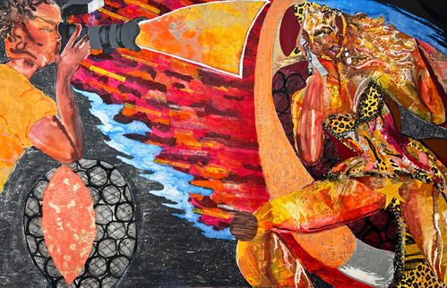 Movin’ & Groovin’ (2022) is a diptych that depicts three figures rendered in this way— the multicolored subjects of the painting have stretched out torsos and limbs, and their skin is patchworked with carefully placed patterns. Lyall’s 12-by-9-inch piece Sherbet (2024) shows a collaged woman with large, pouting lips and multicolored skin. The proportions of the latter piece seem to be reminiscent of a drawing pulled from a designer’s sketchpad, and one eye of the figure looks like it was cut straight out of the pages of Vogue.