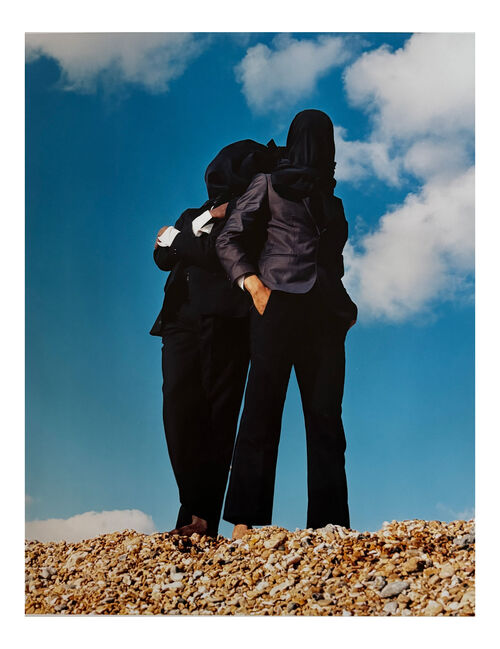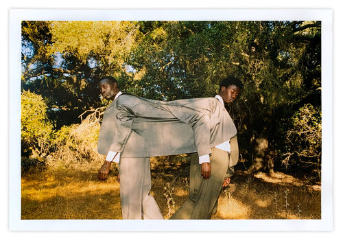 Many of Tyler Mitchell’s photographs evoke the themes of dandyism: In fact, curators at the Metropolitan Museum of Art thought that the 29-year-old artist’s oeuvre embodied the theme so well that they commissioned him to shoot the catalogue for the exhibit. Many of those pictures—which depict Spike Lee, Ayo Edebiri, Dapper Dan, and others—feature elements of dandyism, including strong suits and tailored outerwear. Indeed, many of Mitchell’s other pieces, like Untitled (Brighton) (2018), also speak to the photographer’s interest in fashion. This bold photograph depicts two figures wearing well-fitting black suits, which the viewer can see clearly. However, black fabric obscures the faces of the subjects in a way that’s evocative of René Magritte’s seminal work The Lovers (1928); Mitchell’s decision to highlight the subjects’ outfits—but not their faces—makes us question who the photo’s protagonists are and what their clothes reveal about them.