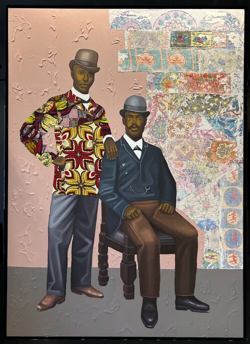 Cornelius Annor’s vibrant paintings showcase his personal family history and Ghanaian fashion. My Baby Doll (2023), for instance, is a tender depiction of a woman and a child; the woman wears an intricately patterned yellow, green, and white dress and a baby blue ribbon affixed to her hair. Cornelius Annor Ma Wo Nsa So Hem Wo Pa (2023) is also replete with colors and textures. The painting’s subjects dance to an unknown beat; they sport flared jeans, patterned tops, and lush afros; and they stand on top of a checked dance floor with collaged tiles. These figures’ ’70s outfits and visible love of partying make them feel like dandies.