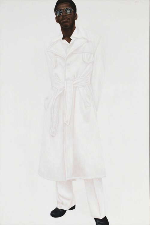 Born in Philadelphia in 1945, Barkley Hendricks worked across multiple media during his lifetime, though he primarily focused on painting and photography. He is best known for his realist oil portraits of Black figures in his community, which were recently the subject of a major survey at The Frick. Most of all, Hendricks is known for the attitude and swagger that his subjects exude, evoking the ethos of Black dandyism. Many of the figures in Hendricks’ paintings are shown in stylish outfits; one such piece, Steve (1976), shows a man dressed in white pants, a white trench coat, and gold-rimmed aviator sunglasses. The soft tailoring and unique touches make the outfit distinctively dandy. Another of Hendrick’s pieces, Bloke (2016), features a stylishly dressed young man: He wears a cotton candy colored suit, reminiscent of the matching ensembles worn by dandies in the Democratic Republic of the Congo. As Antwaun Sargent, who curated The Frick show, told me: “Those choices are important, because he’s also using his styling and editing right on the canvas as a way to deepen our understanding of these people.”
