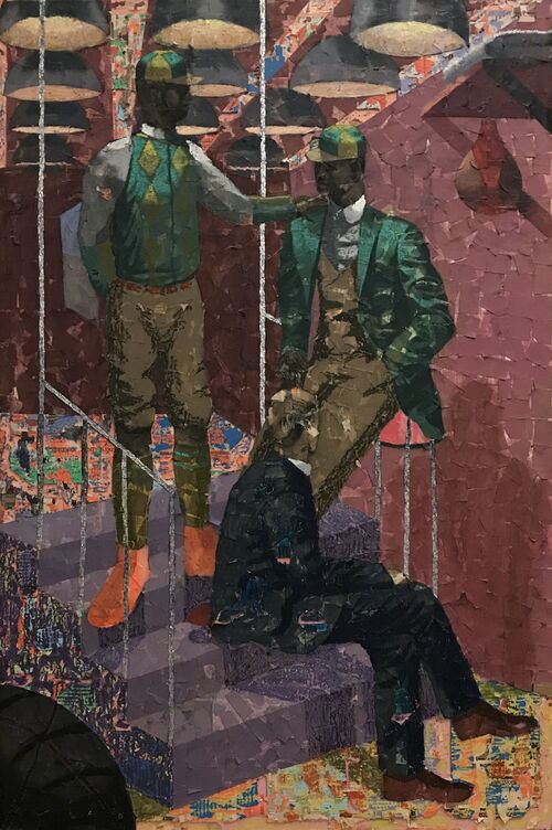 The Memphis-born artist Derek Fordjour has made a career creating multimedia works that combine geometric shapes, layered outfits, and patterned surfaces. Many of his works carefully portray typical rites of passage, in which his Black subjects play a starring role. Fordjour’s piece No. 54 (2017), for instance, uses oil pastel, charcoal, acrylic, cardboard, and carved newspaper mounted on canvas to create a dynamic tableau showing a proud athlete in profile as he looks off into the distance. Another work, STRWMN (2020), shows a man in a lavender bowling hat, a red sports coat, and heeled red shoes. The latter piece evokes the passionate spirit of a Black dandy, as the subject drips with a definitive and unique style. His clothing appears impeccably made, luxurious, and structured, much like many clothes that Black dandies throughout history have gravitated towards.