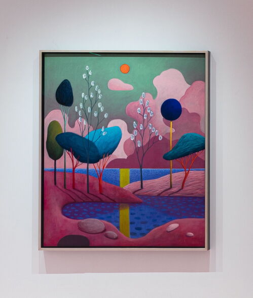 Nicolas Party, like Anderson, adores saturated palettes and fantastical settings. His ambitious worldbuilding practice extends across paintings, murals, installations, and sculptures set in a bright, bulbous universe. This alternate reality is populated by electric blue and red busts and portraits, purple and yellow pears, and craggy, red landscapes. Surrealism and 19th-century Swiss landscape painting inform this work, which vibrates with its own contemporary energy.