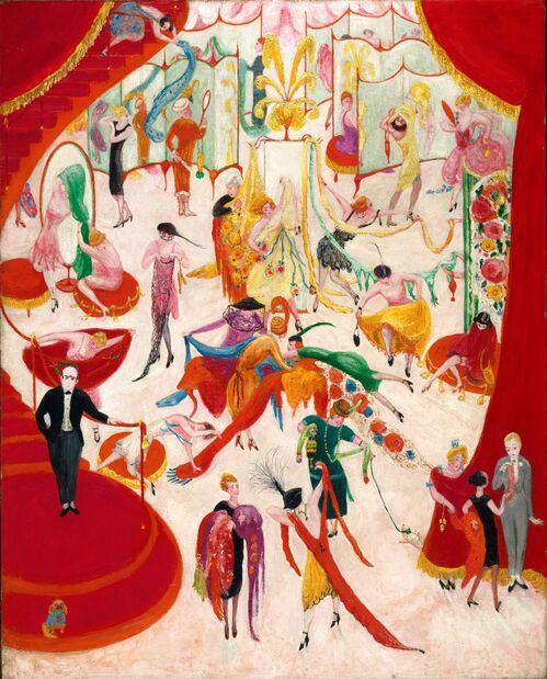 Stettheimer’s scenes embrace brightness and decadence. Her subjects included oversized flowers that dwarf human figures, or a department store bursting with sumptuous fabrics and energy. Stettheimer and her sisters also hosted a salon at their Manhattan home, gathering the artists of their day into a close community.