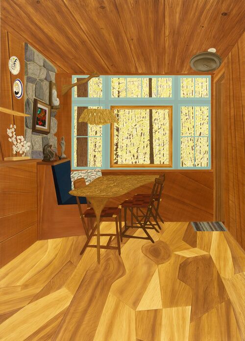 Becky Suss’s paintings of domestic settings are always devoid of their human inhabitants. Chairs, tables, and beds become the main characters, given personalities by the artist’s flat patterns and bright hues. In these images, a bedroom, observatory, or fireplace becomes a world unto itself.