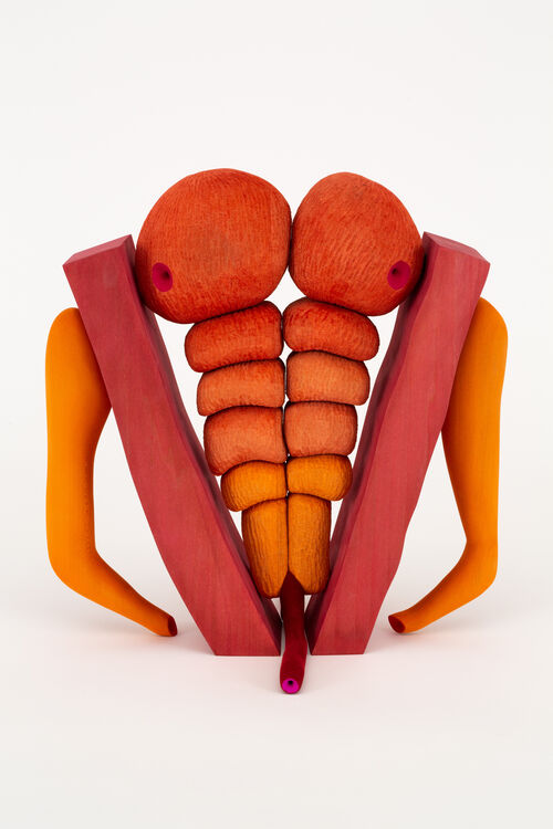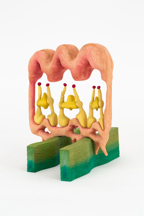 Matthew Ronay’s sculptures evoke colorful machines, landscapes, and intestinal tracts. The artist handcarves and dyes wood, adding texture to his material using grooves, notches, and flocking. His forms contort around each other like puzzle pieces. Despite their suggestive nature—one segment may look like a tongue, another a tree trunk or aorta—the completed sculptures always veer from easy resolution. Instead, Ronay’s colorful arrangements play with balance, suspension, and the relationship between the part and the whole.