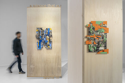 His mixed-media sculptures made of publishing materials—or “book paintings,” as he calls them—are affixed to wooden walls erected within the exhibition, which was curated by Jérôme Sans. These paintings are interactive, inviting viewers to partake in the process of folding and unfolding, just like perusing the pages of a published book. The partitions are also adorned with oversized, electric-colored graphic sculptures made of commercial vinyl, plywood, and inkjet prints on paper.