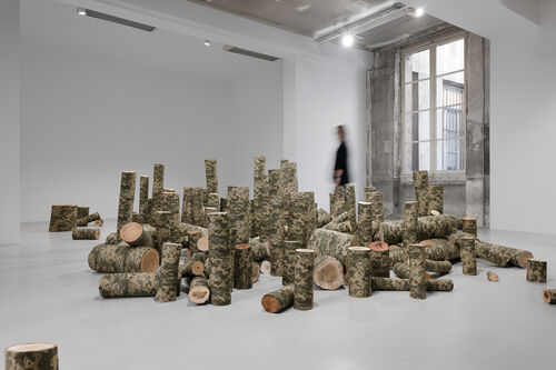 In her practice, Ukrainian artist Zhanna Kadyrova salvages materials like timber, concrete, and brick from the warzone rubble of her homeland. Since the outbreak of the war in 2022, the artist has chosen to remain in her home country to focus on making site-specific works that recount the terror and testimonies of her fellow Ukrainians. Accordingly, the show’s title, “Strategic Locations,” refers to the conflict zones, occupied territories, and shifting front lines of warfare.