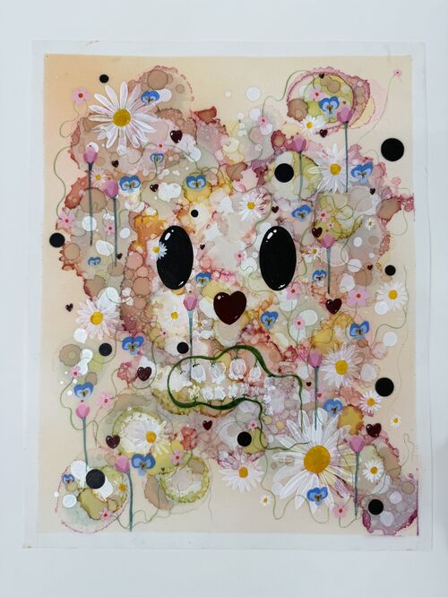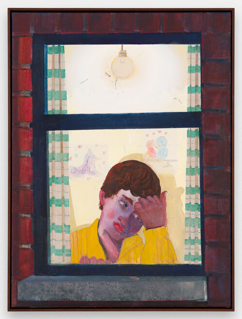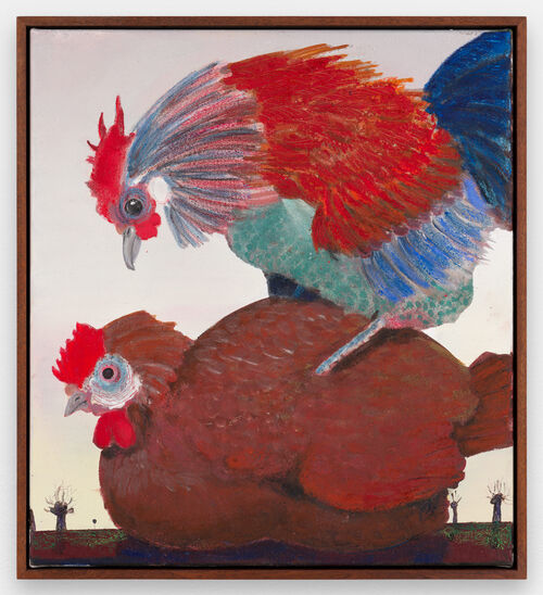 Jennes’s work combines oil painting, crayon, and collage laced with metal staples to create narratives that poignantly trace the arc of romantic love—from the first blushes of romance to emotional unraveling. These paintings play with dizzying scale to incorporate leaves, apples, insects, mushrooms, and tiny trees. His subjects may be human, animal, or plant and often feel juxtaposed with their surroundings, as if on a theatrical set. Jennes’s technique has long been influenced by medieval Islamic miniatures and their flat perspectives, which give the subjects an orchestrated feel.