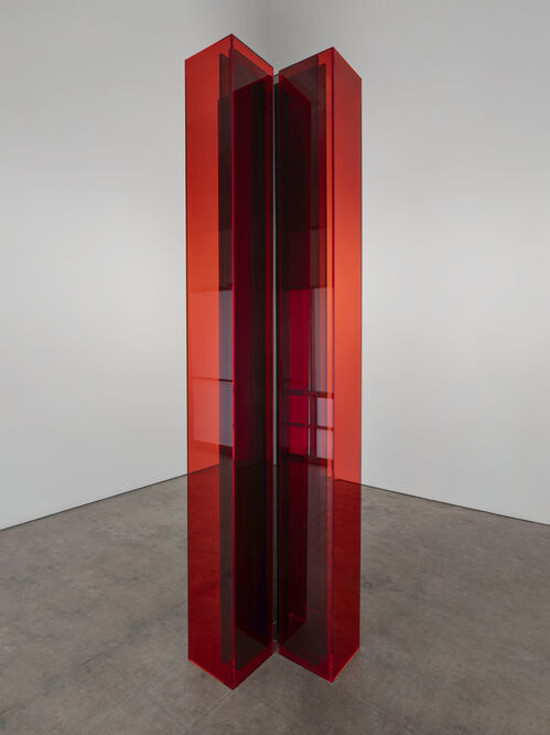 Also included are his freestanding columns of smooth acrylic polymer, where grey slates of the material are encompassed by transparent, cherry-red rectangular forms. With no electrical light source, the works are illuminated by the surrounding daylight, their transparency subtly shifting as the viewer moves around them. With these elegant, prismatic forms, made just years before his death, Irwin revisited his earlier experiments with acrylic polymer, this time using angled materials to allow for further interplay with light.
