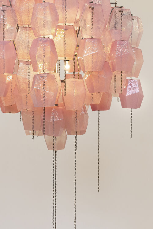 Glasgow-based sculptor, photographer, and installation artist Martin Boyce presents a new body of work that meditates on the passage of time and themes of aging and decay. A cornerstone of Boyce’s practice is the deconstruction and reimagining of iconic works of design, through which he investigates the blurred lines between public and private space. Among the new works presented in this show is a large-scale chandelier composed of 90 hand-blown pink segments. Both the chandelier and the pink glass elements are long-standing recurring motifs in Boyce’s artistic vocabulary. This luxury lighting rig hangs from a spider-like structure of black galvanized steel inspired by Marcel Duchamp’s famous Bottle Rack (1914).