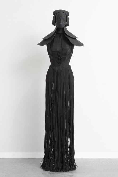 Centered around metamorphosis, this new body of work by French textile artist Jeanne Vicerial is the result of two years of exploration. A rapidly ascending talent (and one to watch), Vicerial is best known for her “presences,” sinewy sculptural forms made of thick, black woven thread. In “Nymphose,” she takes this series further, with new sculptures whose silhouettes are an ode to chrysalises, and the extreme vulnerability and biological restructuring that takes place within them.