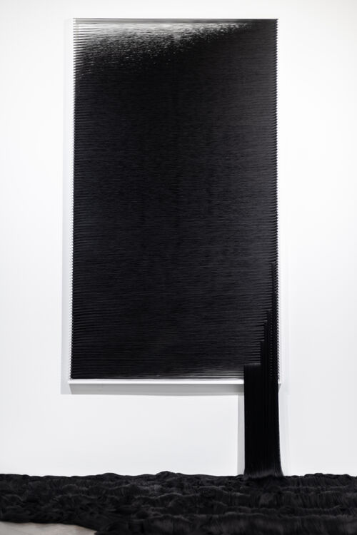 The works, in part, pay homage to French painter, printmaker, and sculptor Pierre Soulages and his signature “Outrenoir” technique, which uses black as a color, a surface, and a way of manipulating light. Vicerial has long been influenced by Soulages’s work, investigating the way that the repetition of black crocheted forms that cascade towards the floor, woven with repetitive gestures, could awaken the material anew. These corporeal beings suggest whispers of a human form within, though they’re abstracted enough to raise questions as to whether it might be a man or woman, a human or a spirit, contained by the structure.