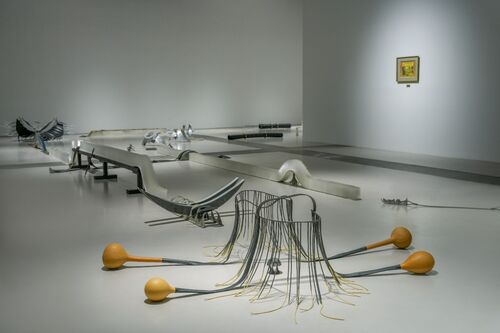 Yang is one of several emerging artists based in the region who make for rewarding discoveries across the shows on view. Other highlights included Tabula Rasa’s show featuring Tant Zhong, whose assemblages of car washing tools, twisted metal, rubber tubes, and other industrial miscellania evoke road signage and viscera. guo cheng’s hanging sculpture of an insect-like figure crafted from twisted Ethernet cables is the anchor of Magician Space’s show—which won the weekend’s best exhibition award. It takes the word ‘bug’ as a cue to explore the dualities between computer bugs and insects. Vietnamese artist Nguyễn Trinh Thi’s multichannel immersive film installation, 47 Days, Sound-Less (2024), at SPURS, which won the Infinity prize, is another standout. The work positions two projection screens diagonally across from each other, accompanied by a mirror system suspended from the ceiling. In the installation, the artist explores how, in the film Apocalypse Now, villagers from Ifugao, northern Philippines, were cast to stand in for Vietnamese Indigenous peoples. Bringing together chanting of Vietnam’s Jarai people with jungle sound effects drawn from Hollywood war films and misaligned subtitles from science fiction texts, the work is both disorienting and moving.