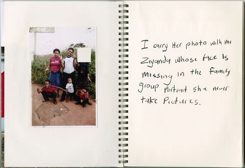 Sobekwa started I carry Her photo with Me when he found a family portrait with his older sister’s face cut out. This photograph is the only photo Sobekwa has of his sister, who ran away from home after inadvertently causing Sobekwa to be hit by a car when he was seven years old. She returned a decade later, but refused to let Sobekwa take her photo. Shortly after, she passed away. I carry Her photo with Me is a scrapbook-like publication that comprises photographs, handwritten notes, and family snapshots that the artist assembled to document his sister’s life without her photo. The work also touches on the aftermath of Apartheid and colonialism in South Africa.