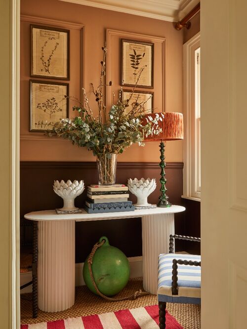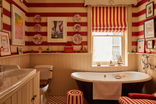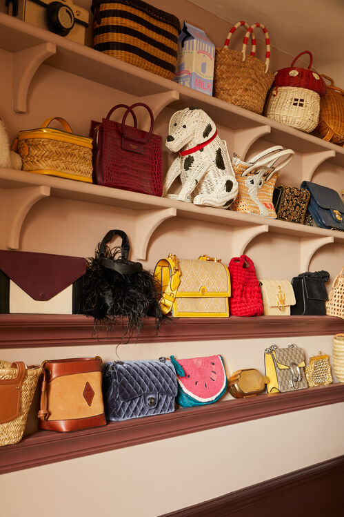 For stylist and fashion designer Sarah Corbett-Winder, art isn’t confined to frames on the wall—it’s everywhere. She sees it in the bold stripes that run through her North West London house, in the curated chaos of her handbag wall, even in a single lost loafer perched lovingly atop a painting. There are also striking contemporary works thoughtfully placed throughout the joyful home she shares with her husband, Ned, their children, and their dachshund, Margaret.