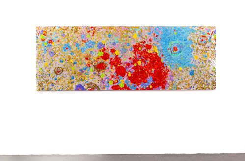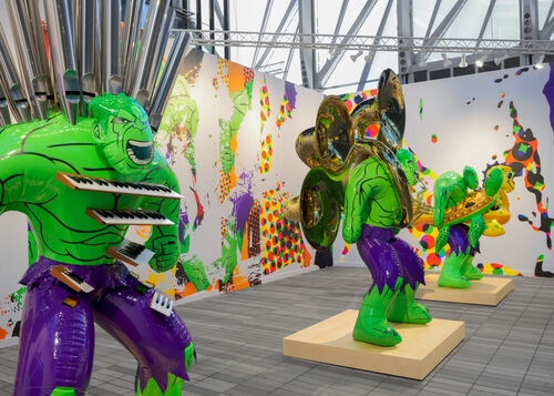Set against a vinyl, comic-book graphic booth backdrop adapted from the artist’s painting Triple Hulk Elvis III (2007), the presentation houses a trio of “Hulk Elvis” sculptures, first started in 2004. The figures of the iconic Marvel superhero appear like inflatables at first glance, but are in fact constructed in bronze and other materials. One Hulk is wielding an organ, another a tuba (both instruments are fully functional), and the third is wrapped in two inflatable swim floats. All three are from Koons’s personal collection, and glare menacingly out at passersby, redolent of the rage that was shared by more than a few VIPs towards the sculptures at the fair’s preview. “‘Hulk Elvis’ represents for me both Western and Eastern cultures, a sense of a guardian, a protector, that at the same time is capable of bringing the house down,” Koons has said.