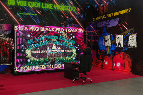 The gallery will also present different video games by the artist throughout the fair. On Thursday, the gallery will present WE ARE HERE BECAUSE OF THOSE THAT ARE NOT / BLACKTRANSARCHIVE.COM (2024), a work not for sale. Friday will feature PIRATING BLACKNESS / BLACKTRANSSEA.COM (2021), also available in an edition of three for £18,000 ($23,900) each.