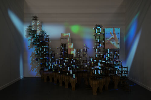 Indeed, the installation produces an almost hypnotic experience for the viewer, diverting one’s attention from different screens to panels, in which imagery is scattered and refracted, forgotten and half remembered—an experience reminiscent of an algorithmically charged doomscroll. This is a bleak internet, a far cry from the techno-optimism of old: “How we use the internet these days, it’s just very much trapped social media and pre-made platforms,” Song said. The installation, which is priced in the range of $22,000 to $30,000, is an edition of three. One edition had sold in the early hours of the fair.